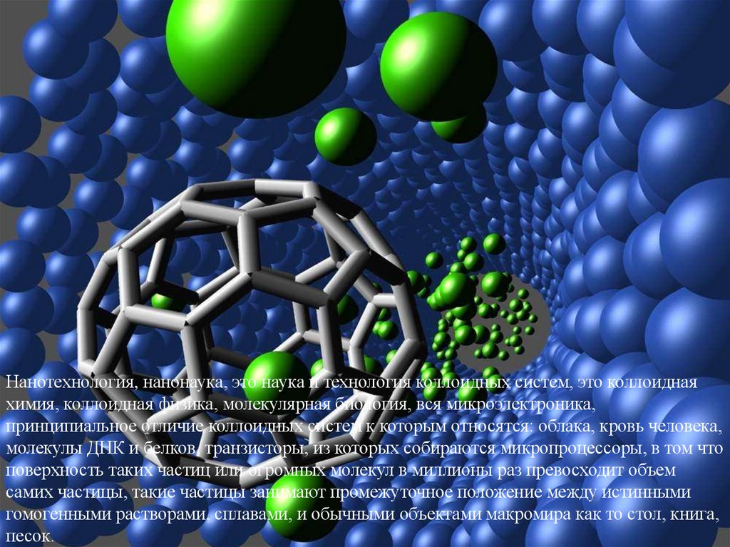 Нанотехнология, нанонаука, это наука и технология коллоидных систем, это коллоиднаяхимия, коллоидная физика, молекулярная биология, вся микроэлектроника,