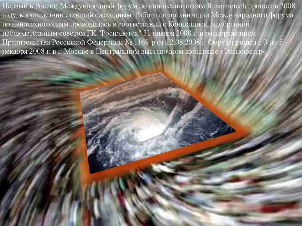 Первый в России Международный форум по нанотехнологиям Rusnanotech прошел в 2008году, впоследствии ставший ежегодным. Работа по организации Международного форума
