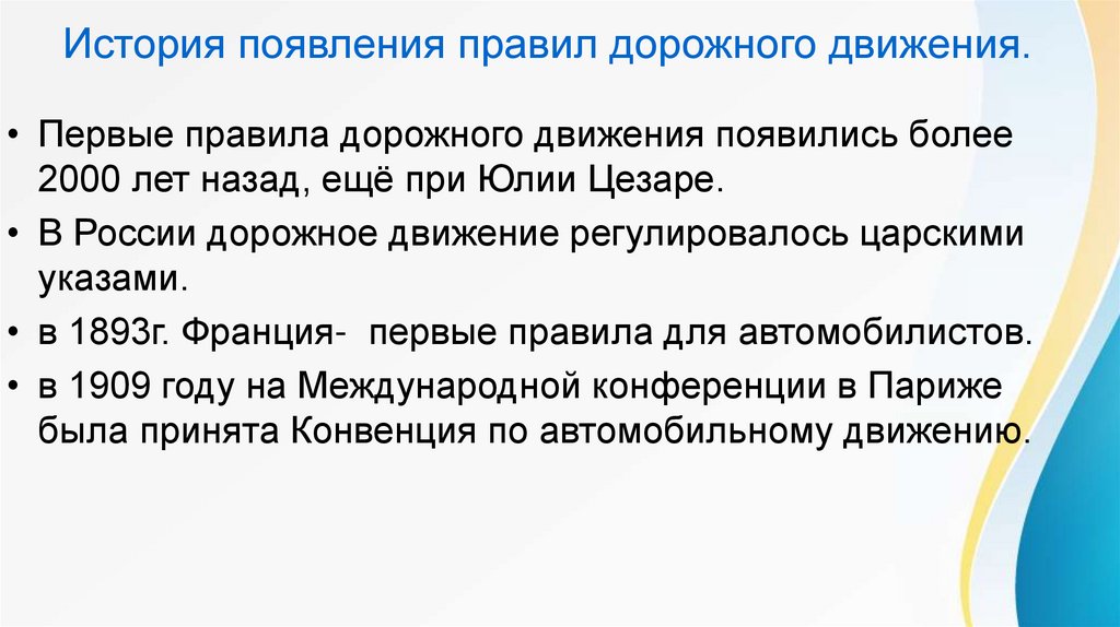 История появления правил дорожного движения.• Первые правила дорожного движения появились более