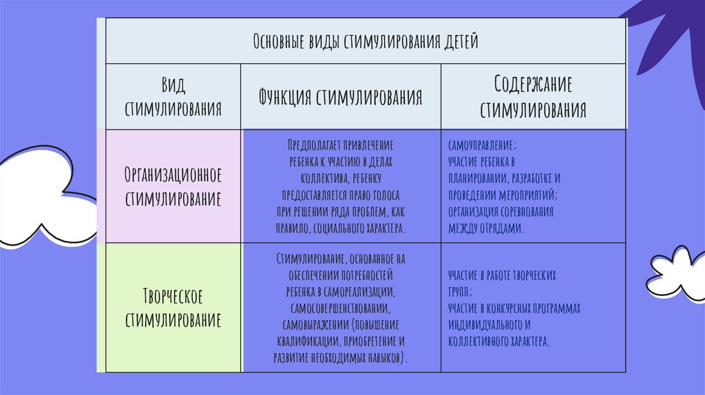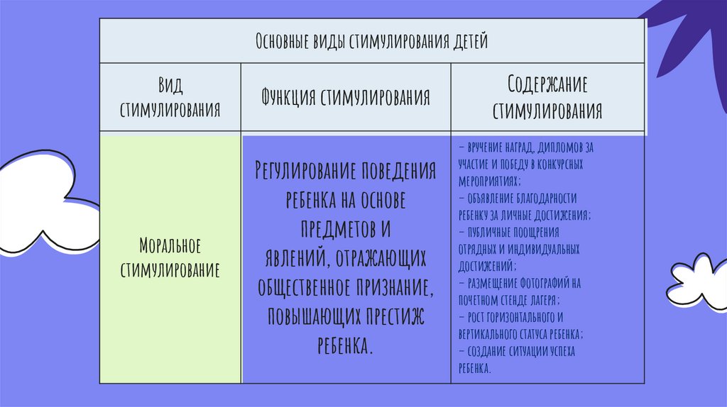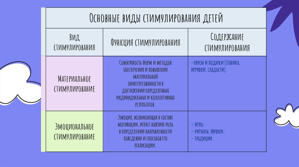 Основные виды стимулирования детейВид