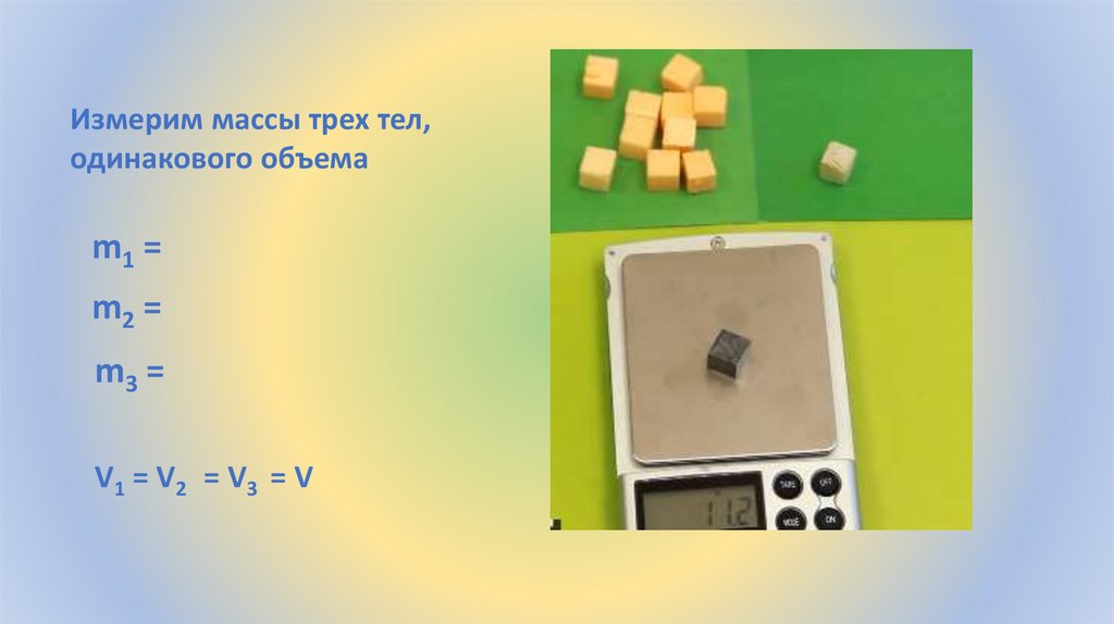 Измерим массы трех тел,одинакового объема