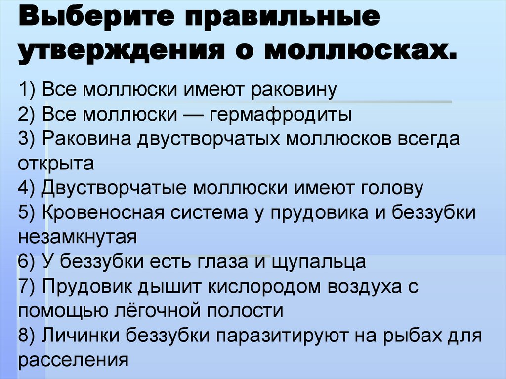 1) Все моллюски имеют раковину2) Все моллюски — гермафродиты