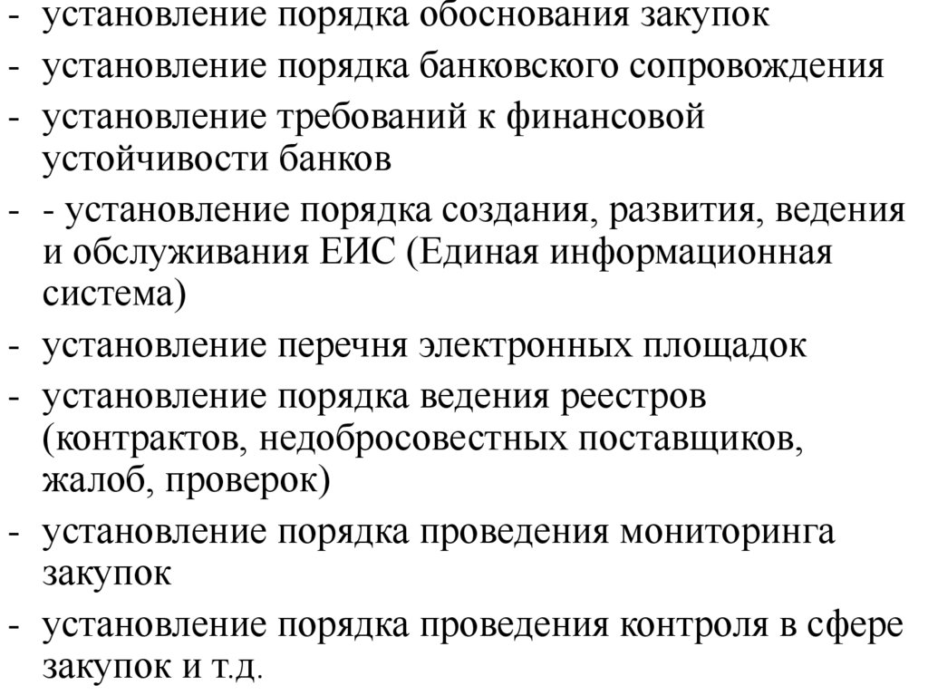 - установление порядка обоснования закупок- установление порядка банковского сопровождения