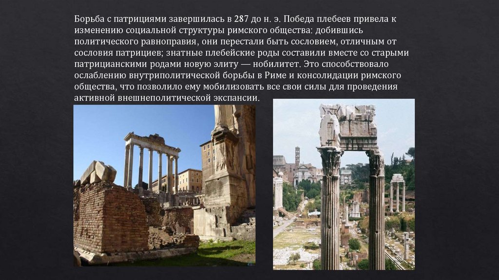 Борьба с патрициями завершилась в 287 до н. э. Победа плебеев привела кизменению социальной структуры римского общества: добившись