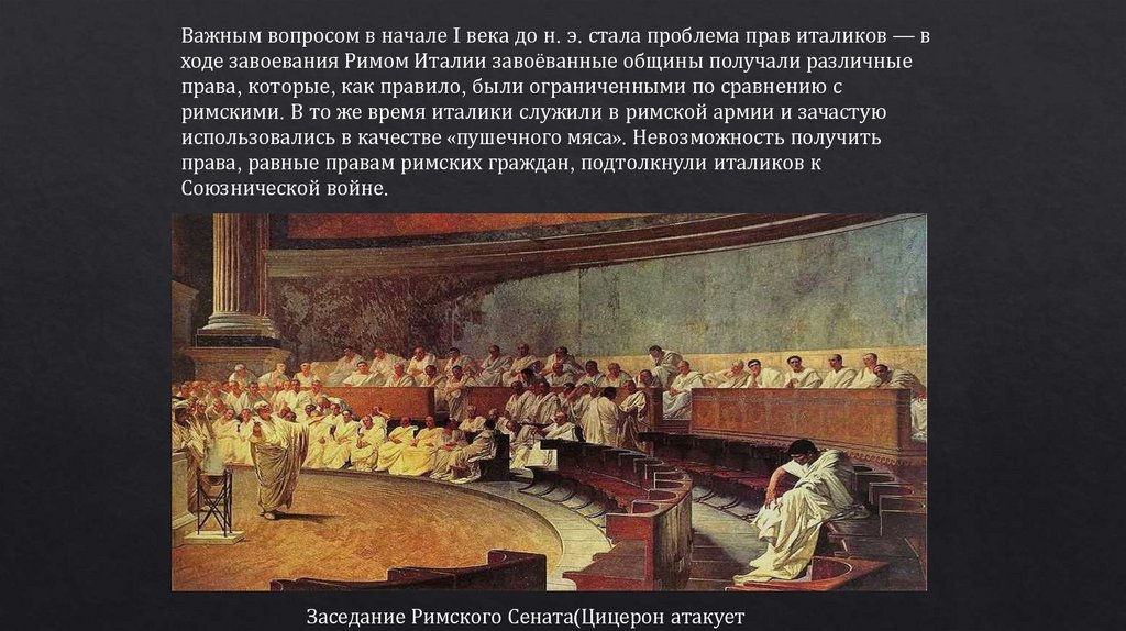 Важным вопросом в начале I века до н. э. стала проблема прав италиков — входе завоевания Римом Италии завоёванные общины получали различные