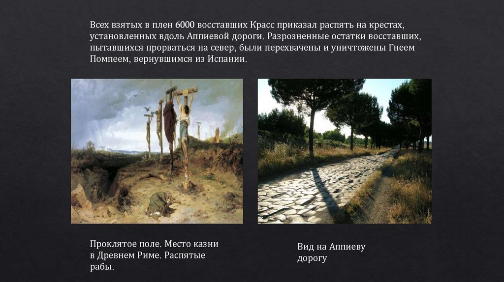 Всех взятых в плен 6000 восставших Красс приказал распять на крестах,установленных вдоль Аппиевой дороги. Разрозненные остатки восставших,