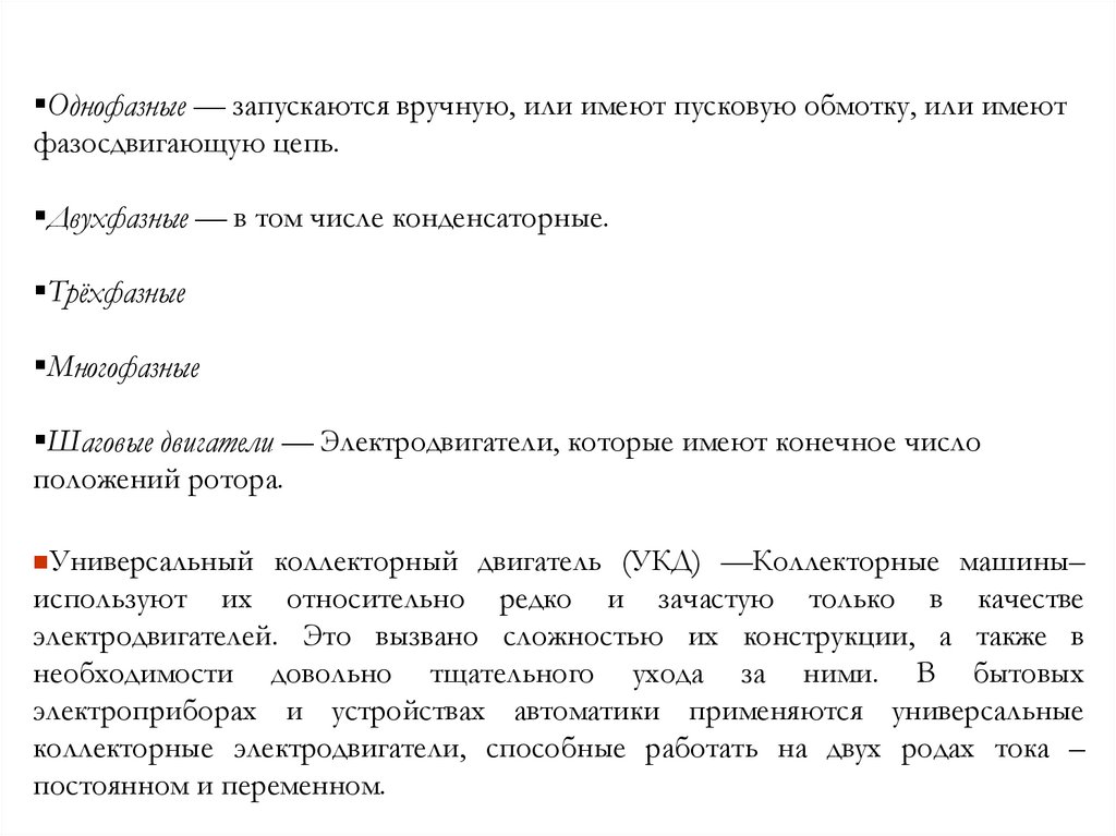 Однофазные — запускаются вручную, или имеют пусковую обмотку, или имеютфазосдвигающую цепь.