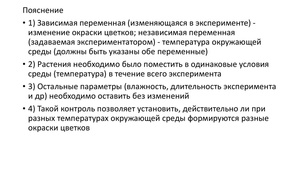 Пояснение• 1) Зависимая переменная (изменяющаяся в эксперименте) изменение окраски цветков; независимая переменная