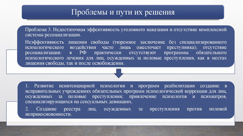 Проблемы и пути их решенияПроблема 3. Недостаточная эффективность уголовного наказания и отсутствие комплексной