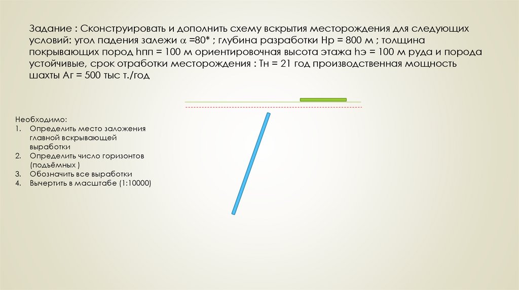 Задание : Сконструировать и дополнить схему вскрытия месторождения для следующихусловий: угол падения залежи =80* ; глубина разработки Hр = 800 м ; толщина