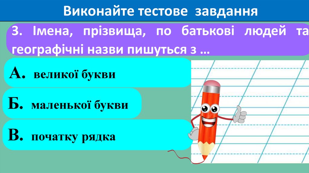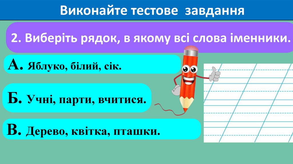 Виконайте тестове завдання2. Виберіть рядок, в якому всі слова іменники.