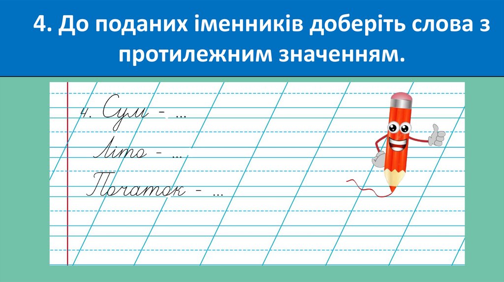 4. До поданих іменників доберіть слова зпротилежним значенням.