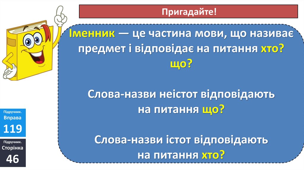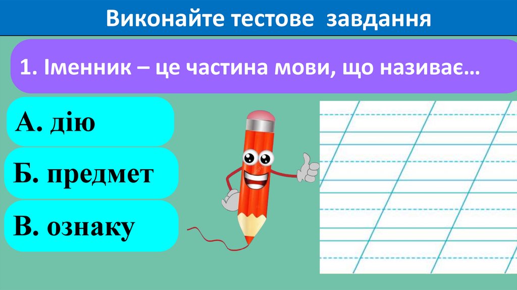 Виконайте тестове завдання1. Іменник – це частина мови, що називає…
