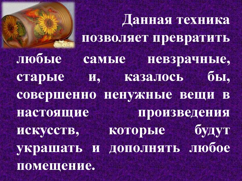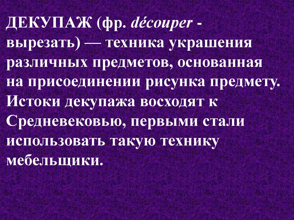 ДЕКУПАЖ (фр. découper вырезать) — техника украшенияразличных предметов, основанная