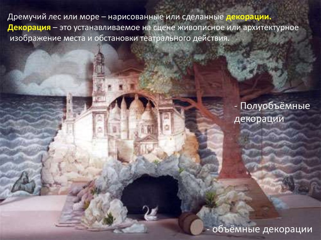 Дремучий лес или море – нарисованные или сделанные декорации.Декорация – это устанавливаемое на сцене живописное или архитектурное
