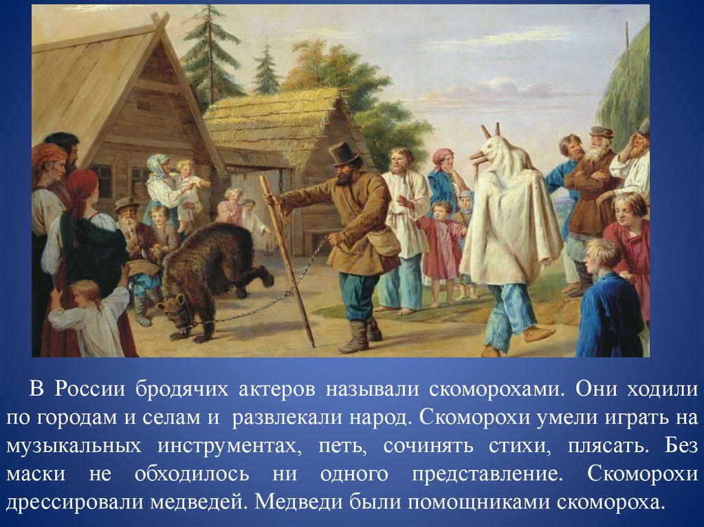 В России бродячих актеров называли скоморохами. Они ходилипо городам и селам и развлекали народ. Скоморохи умели играть на