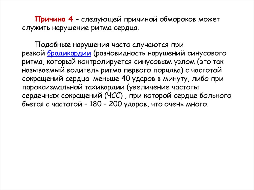 Причина 4 - следующей причиной обмороков можетслужить нарушение ритма сердца.