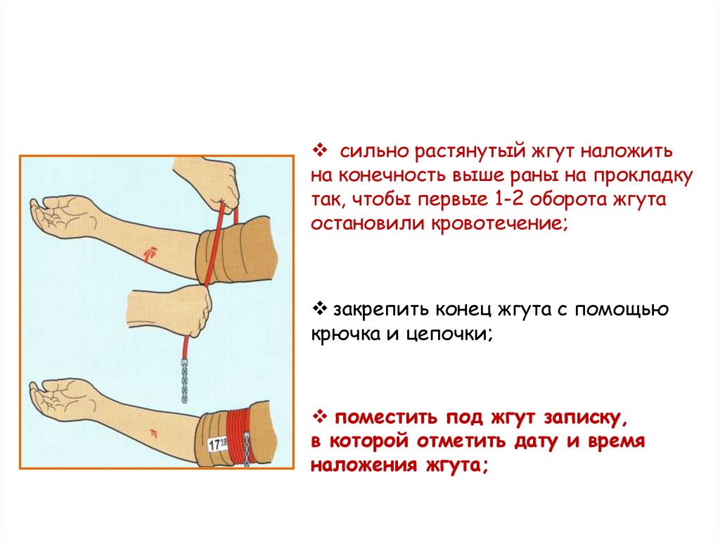 сильно растянутый жгут наложитьна конечность выше раны на прокладку