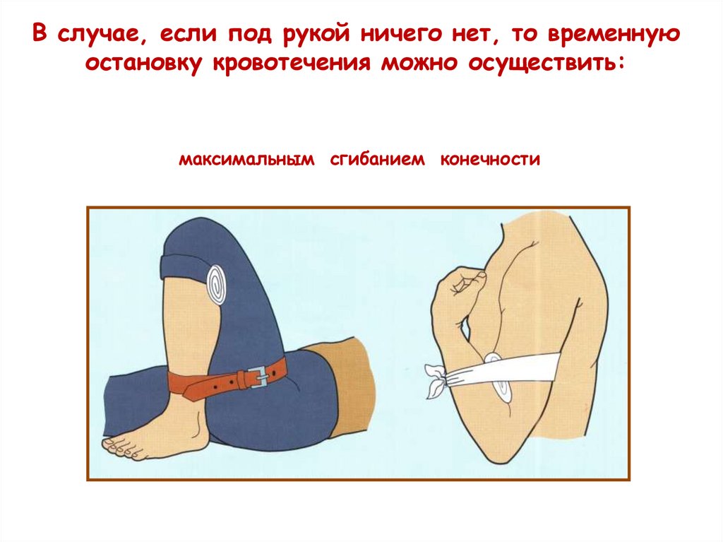 В случае, если под рукой ничего нет, то временнуюостановку кровотечения можно осуществить: