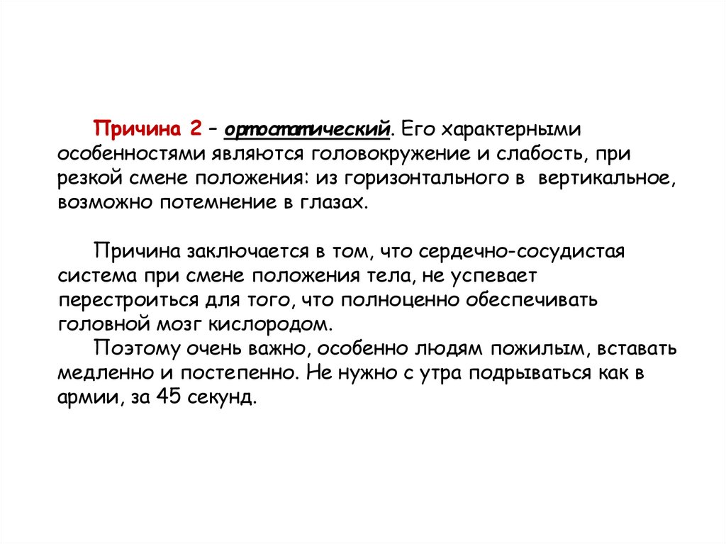 Причина 2 – орт ост ат ический. Его характернымиособенностями являются головокружение и слабость, при