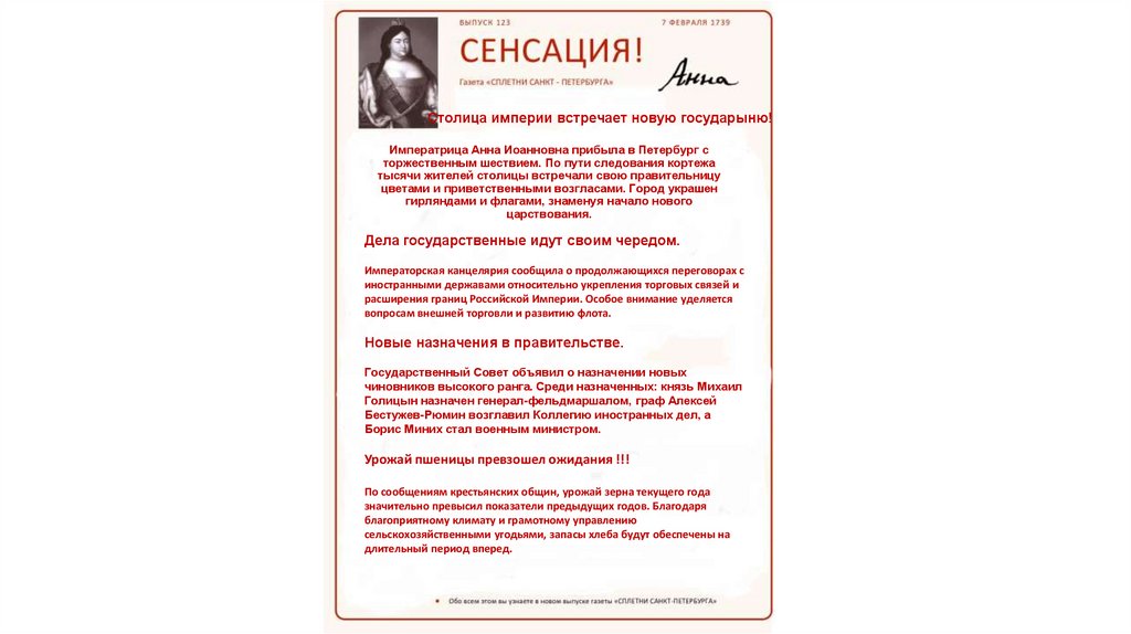 Императрица Анна Иоанновна прибыла в Петербург сторжественным шествием. По пути следования кортежа