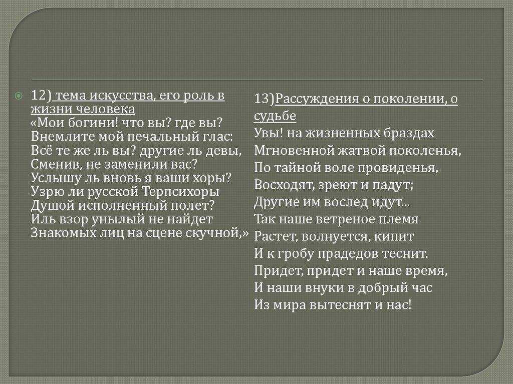 12) тема искусства, его роль в13)Рассуждения о поколении, о