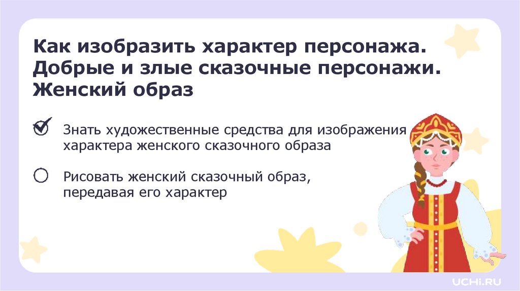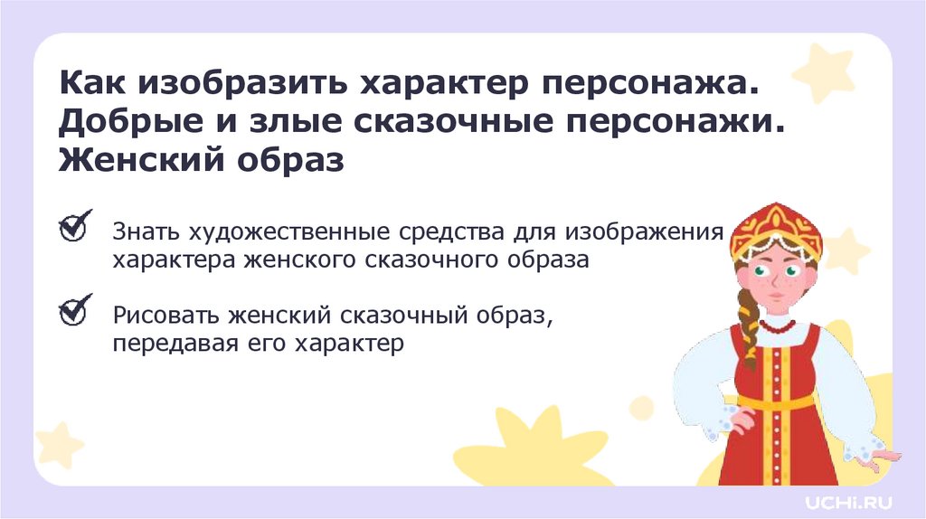 ИЗО, 2 класс, Как изобразить характер персонажа. Добрые и злые сказочные персонажи. Женский образ