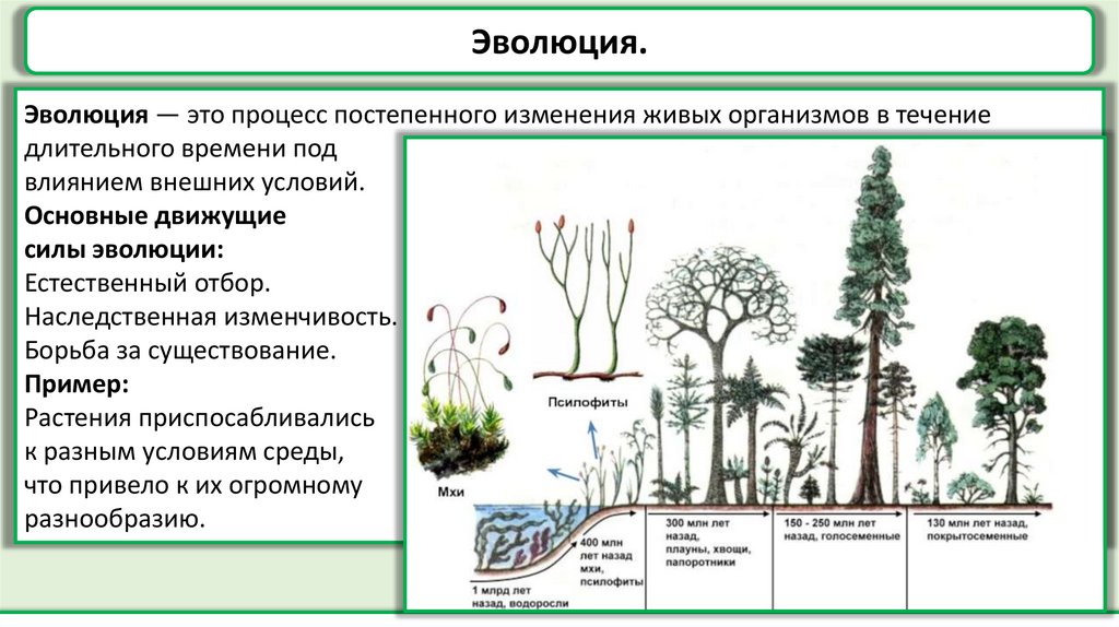 Эволюция.Эволюция — это процесс постепенного изменения живых организмов в течение