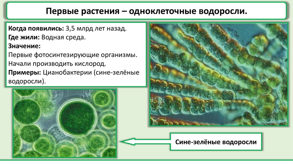 Первые растения – одноклеточные водоросли.Когда появились: 3,5 млрд лет назад.