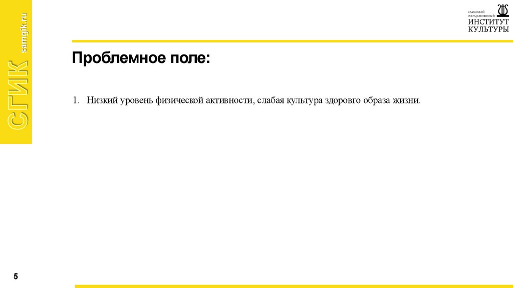1. Низкий уровень физической активности, слабая культура здоровго образа жизни.
