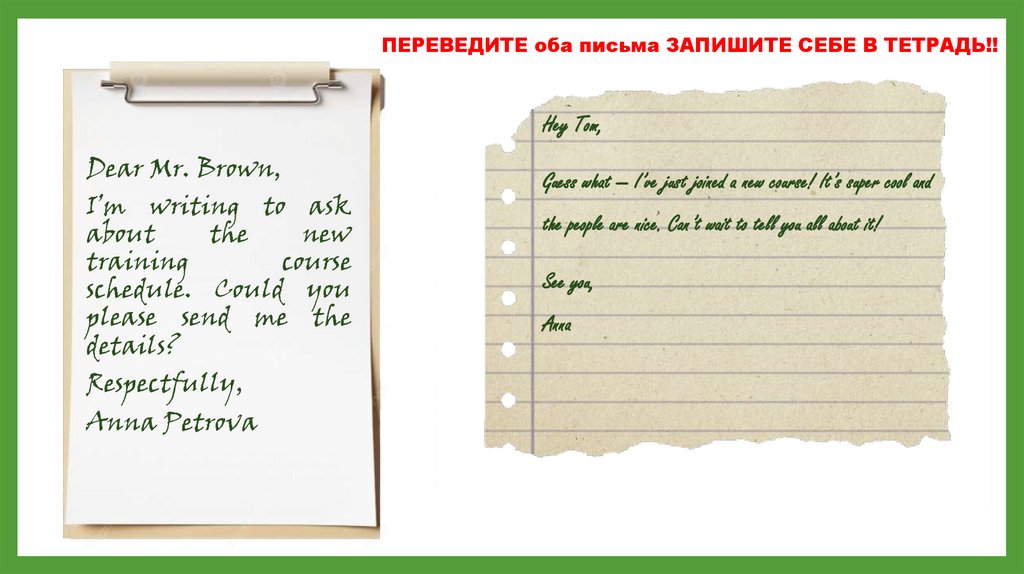 ПЕРЕВЕДИТЕ оба письма ЗАПИШИТЕ СЕБЕ В ТЕТРАДЬ!!Hey Tom,