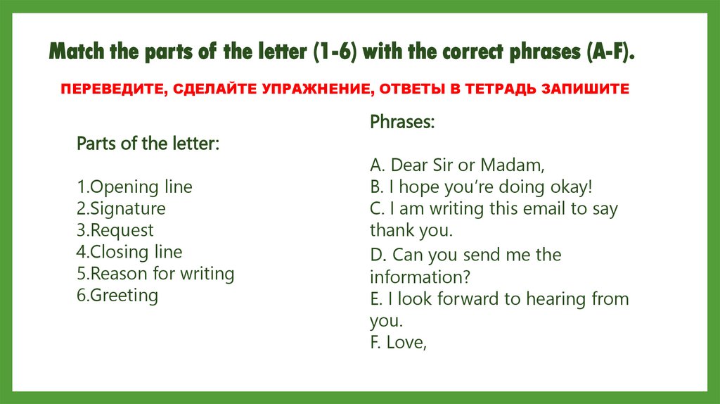 Match the parts of the letter (1-6) with the correct phrases (A-F).ПЕРЕВЕДИТЕ, СДЕЛАЙТЕ УПРАЖНЕНИЕ, ОТВЕТЫ В ТЕТРАДЬ ЗАПИШИТЕ