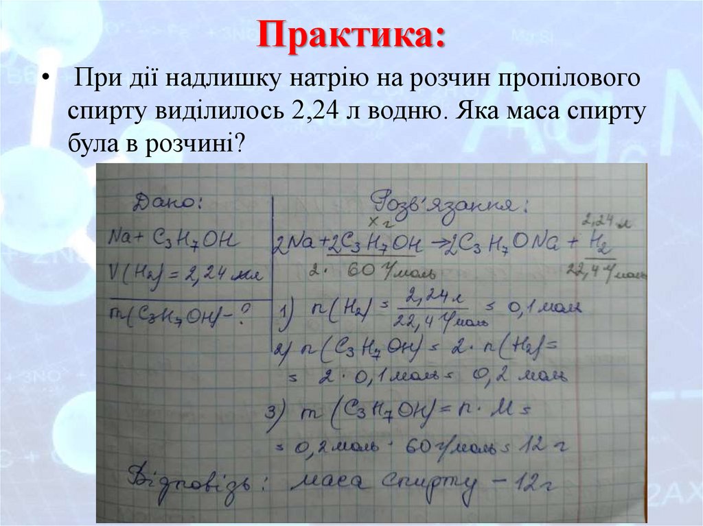 Практика:• При дії надлишку натрію на розчин пропілового