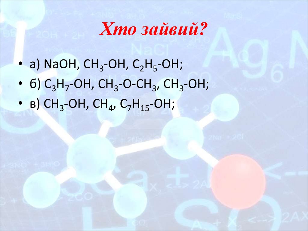 Хто зайвий?• а) NaOH, CH3-OH, C2H5-OH;