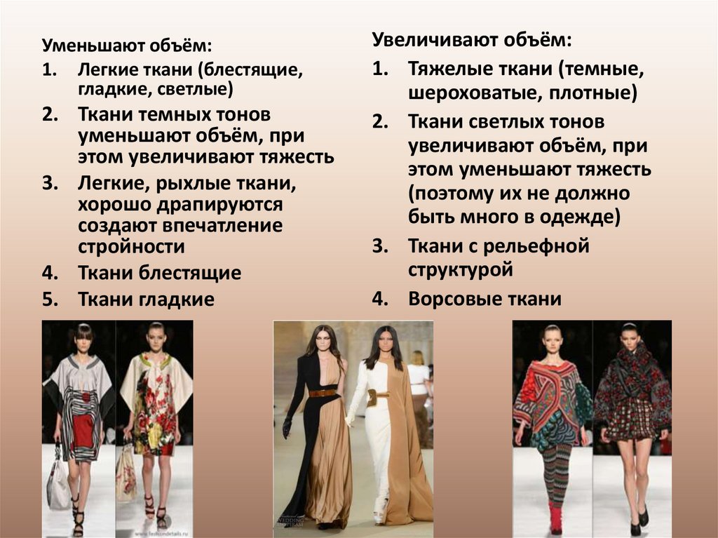 Уменьшают объём:1. Легкие ткани (блестящие,