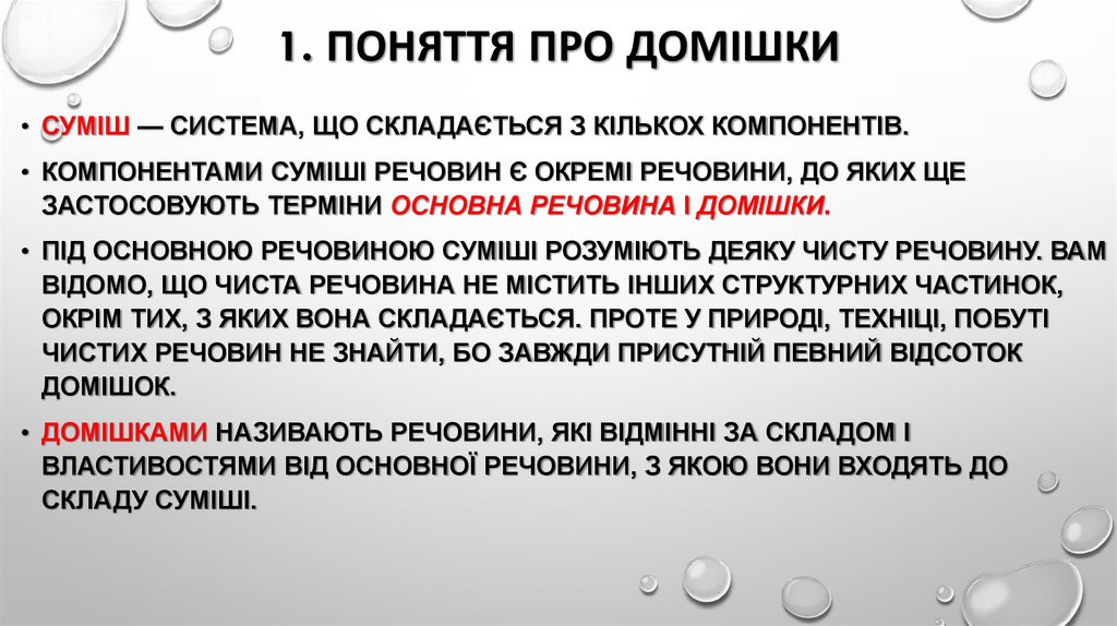 • ДОМІШКАМИ НАЗИВАЮТЬ РЕЧОВИНИ, ЯКІ ВІДМІННІ ЗА СКЛАДОМ І