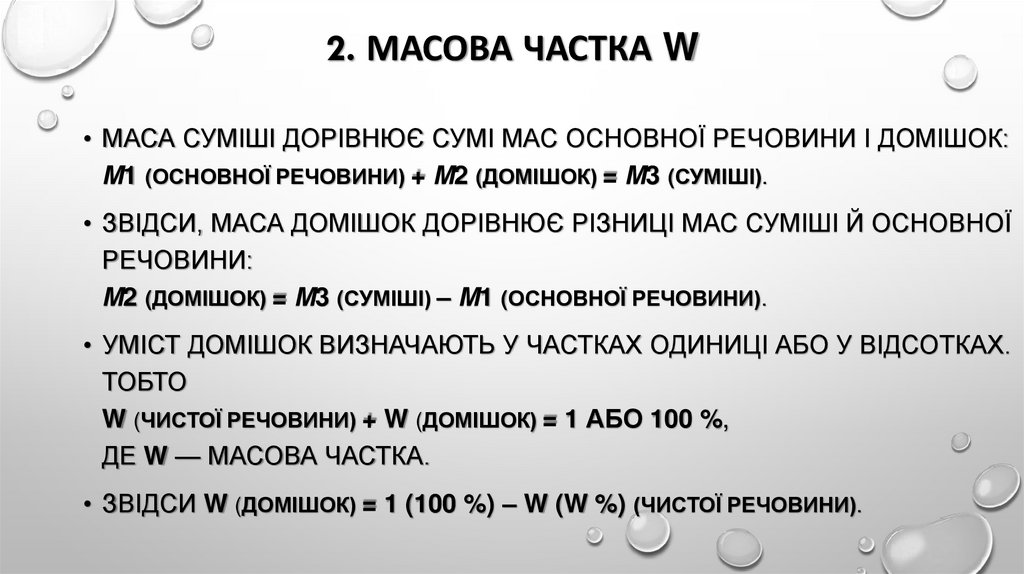 2. МАСОВА ЧАСТКА W• МАСА СУМІШІ ДОРІВНЮЄ СУМІ МАС ОСНОВНОЇ РЕЧОВИНИ І ДОМІШОК: