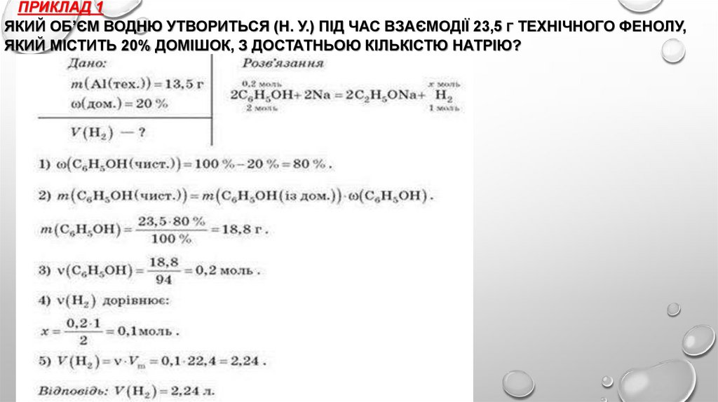 ПРИКЛАД 1ЯКИЙ ОБ’ЄМ ВОДНЮ УТВОРИТЬСЯ (Н. У.) ПІД ЧАС ВЗАЄМОДІЇ 23,5 Г ТЕХНІЧНОГО ФЕНОЛУ,