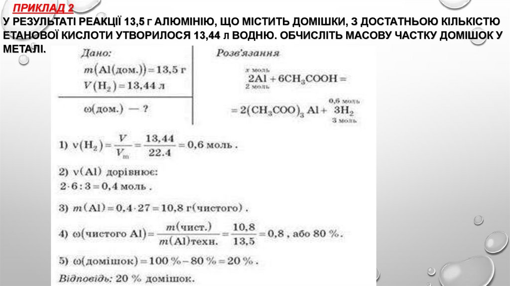 ПРИКЛАД 2У РЕЗУЛЬТАТІ РЕАКЦІЇ 13,5 Г АЛЮМІНІЮ, ЩО МІСТИТЬ ДОМІШКИ, З ДОСТАТНЬОЮ КІЛЬКІСТЮ