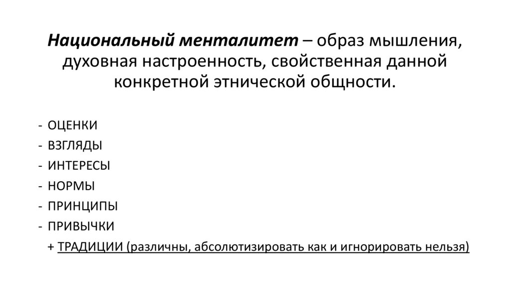 Национальный менталитет – образ мышления,духовная настроенность, свойственная данной