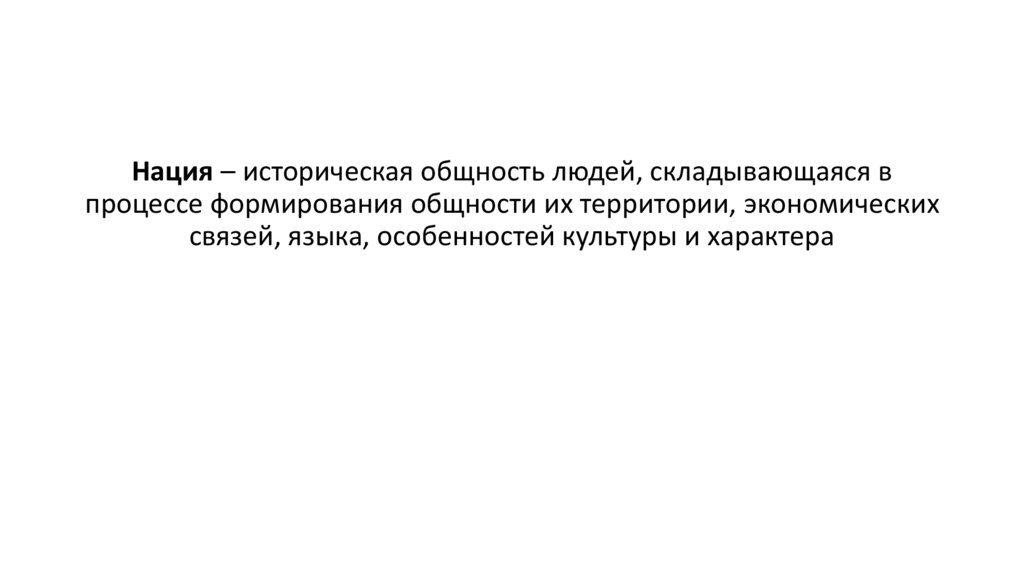 Нация – историческая общность людей, складывающаяся впроцессе формирования общности их территории, экономических