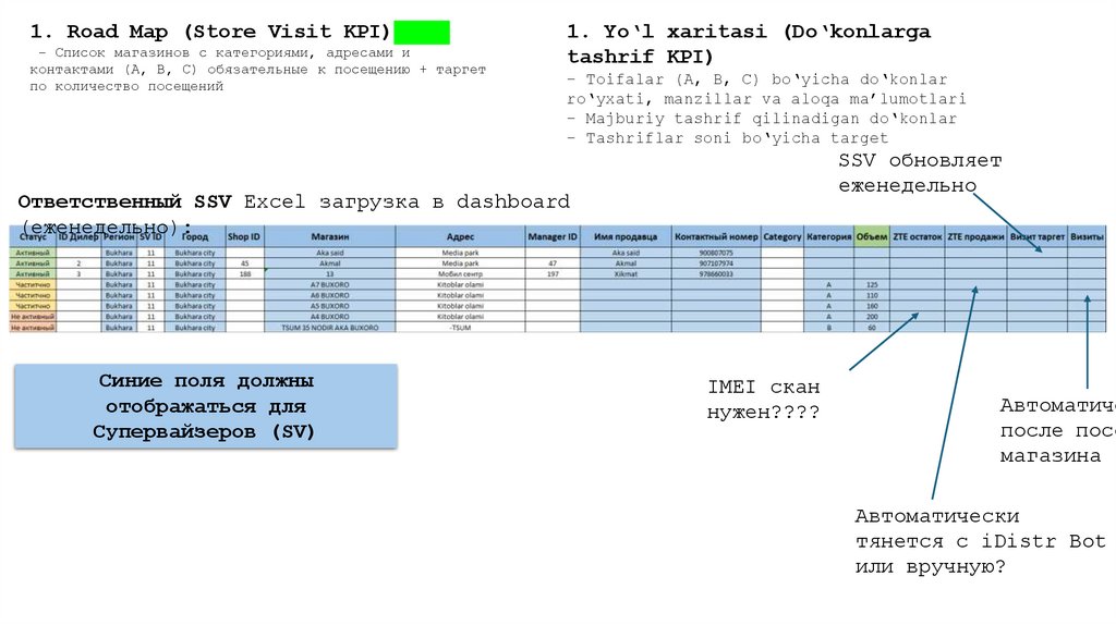1. Road Map (Store Visit KPI)- Список магазинов с категориями, адресами и