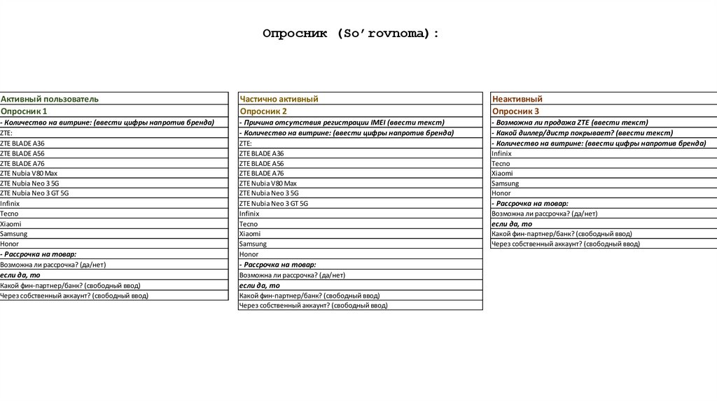 - ZTE, Infinix, Tecno, Xiaomi, Samsung, Honor – количество на витрине
