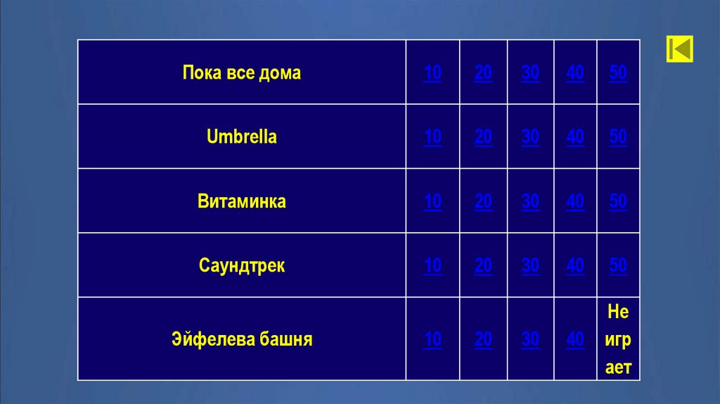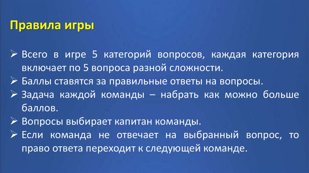 Правила игрыВсего в игре 5 категорий вопросов, каждая категория