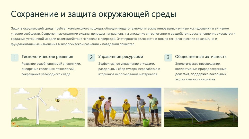 Сохранение и защита окружающей средыЗащита окружающей среды требует комплексного подхода, объединяющего технологические инновации, научные исследования и активное
