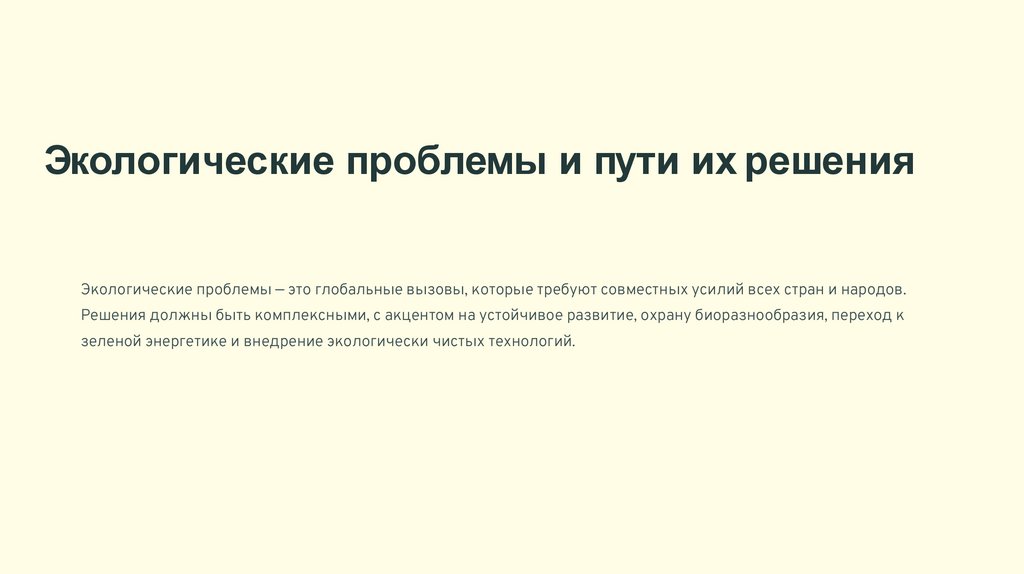 Экологические проблемы и пути их решенияЭкологические проблемы — это глобальные вызовы, которые требуют совместных усилий всех стран и народов.