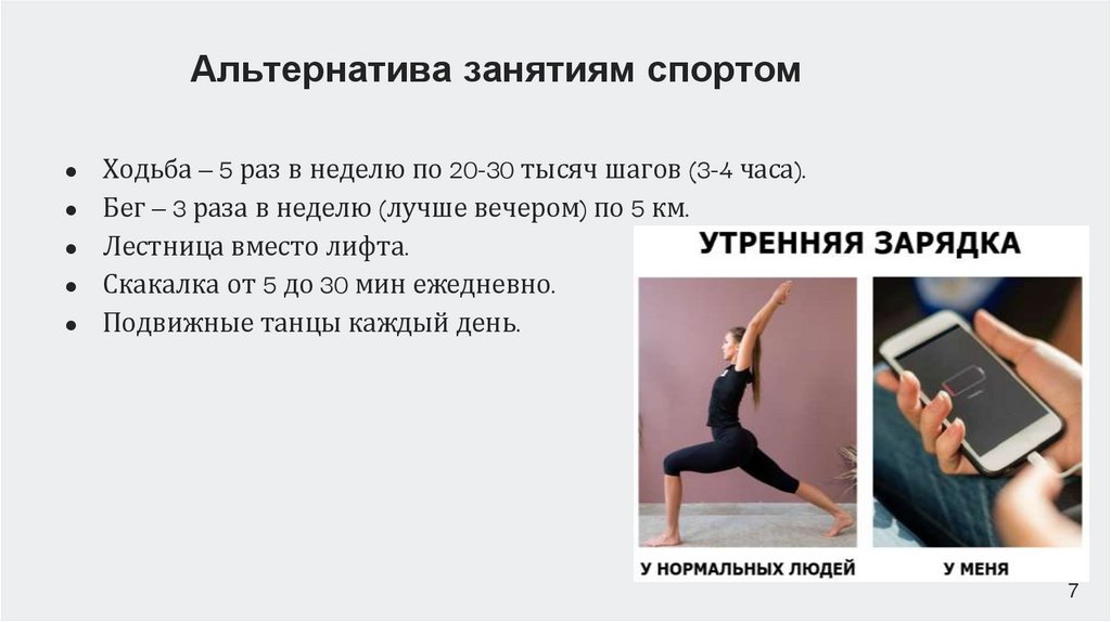 Альтернатива занятиям спортомХодьба – 5 раз в неделю по 20-30 тысяч шагов (3-4 часа).