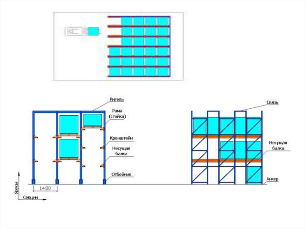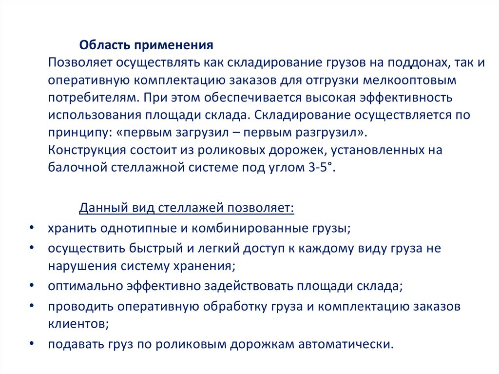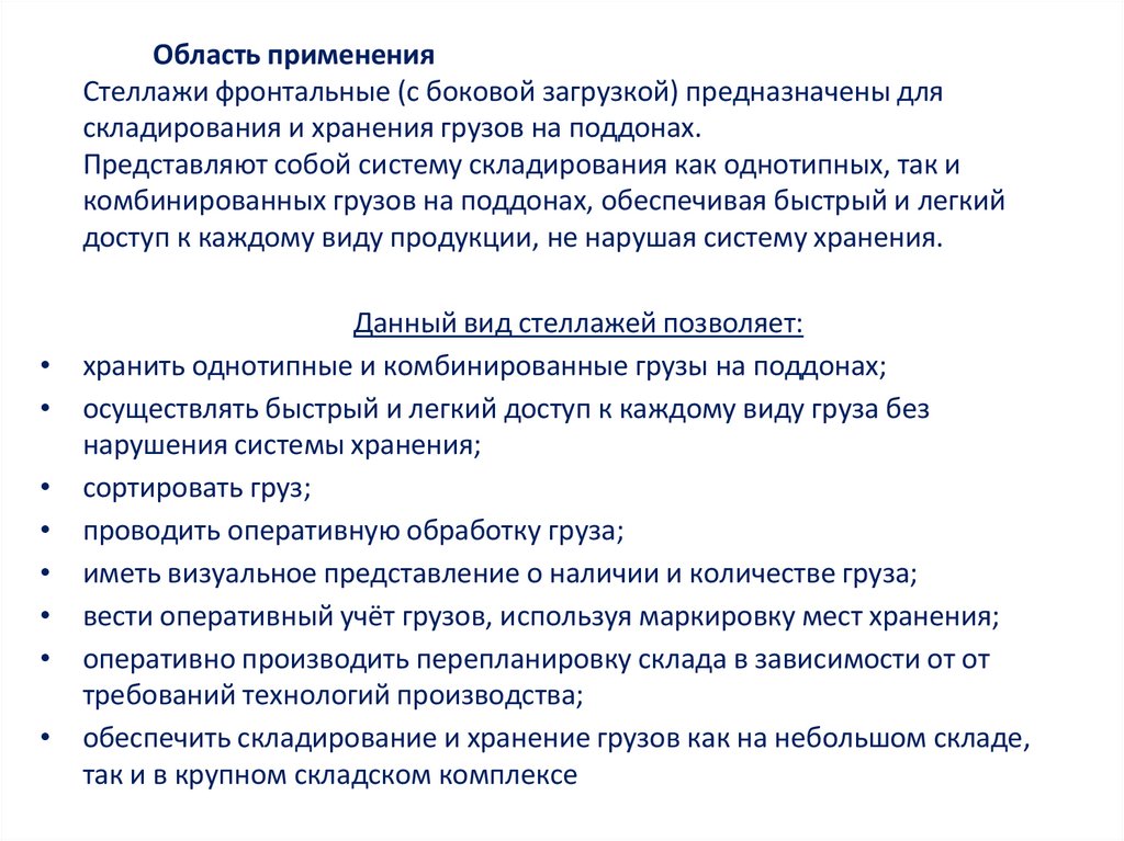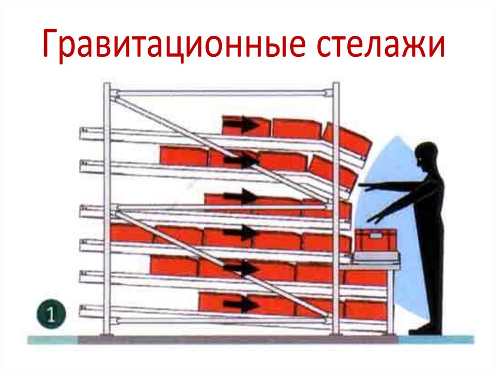конвейера, погрузчика или лифта. Для удобства обработки грузов стеллажи