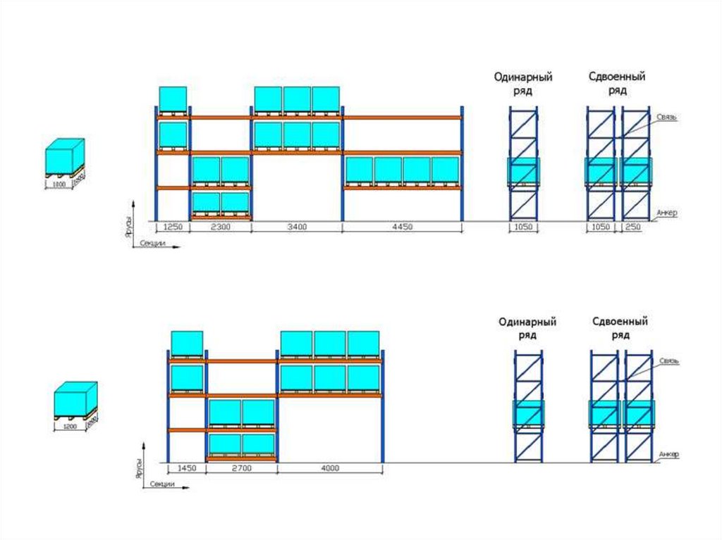 хранить однотипные и комбинированные грузы на поддонах и полках;