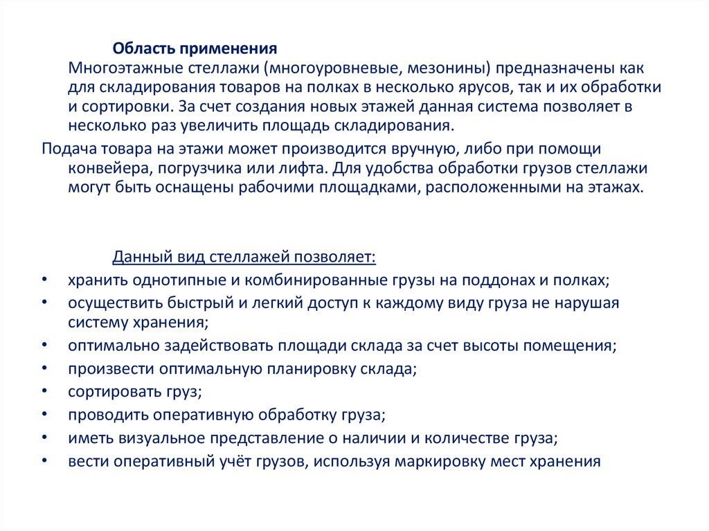 Область примененияМногоэтажные стеллажи (многоуровневые, мезонины) предназначены как